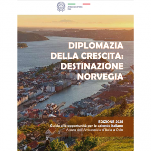 La guida dal titolo Diplomazia della crescita: destinazione Norvegia propone di rafforzare la presenza economica italiana in Norvegia, facilitando l’accesso delle imprese e degli investitori italiani al mercato locale e promuovendo nuove partnership strategiche, incluso il settore scientifico. La guida include approfondimenti sulla normativa sindacale, fiscale e doganale norvegese, nonché sui passi necessari per stabilire un’attività in Norvegia. Vengono inoltre proposte analisi settoriali su oil&gas, energie rinnovabili, infrastrutture e costruzioni, prodotti alimentari, bevande, cosmetica e abbigliamento e attrezzature per la montagna.